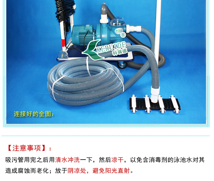 吸污管用完之后用清水沖洗一下,然后瀝干,以免含消毒劑的泳池水對其造成腐蝕而加速老化;收放時(shí)放于陰涼處,避免陽光直射。