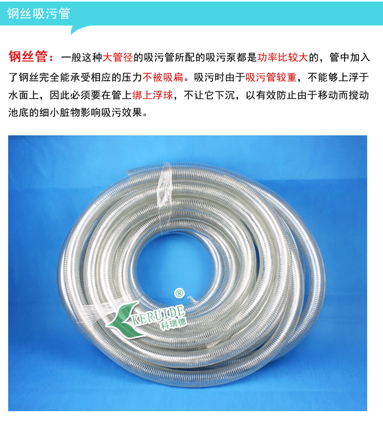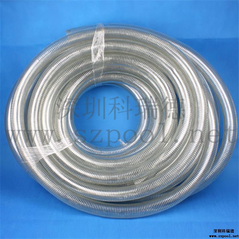 鋼絲吸污管是游泳池手動吸污機的主要部件之一,與吸污泵、吸污頭或吸污盤、伸縮桿及吸污機小推車等組合成一套完整的游泳池組合式吸污機,主要功能是用來對游泳池及景觀池、養(yǎng)魚池進行水下吸塵,將池底的臟物吸走,起到清潔池底的重要作用。