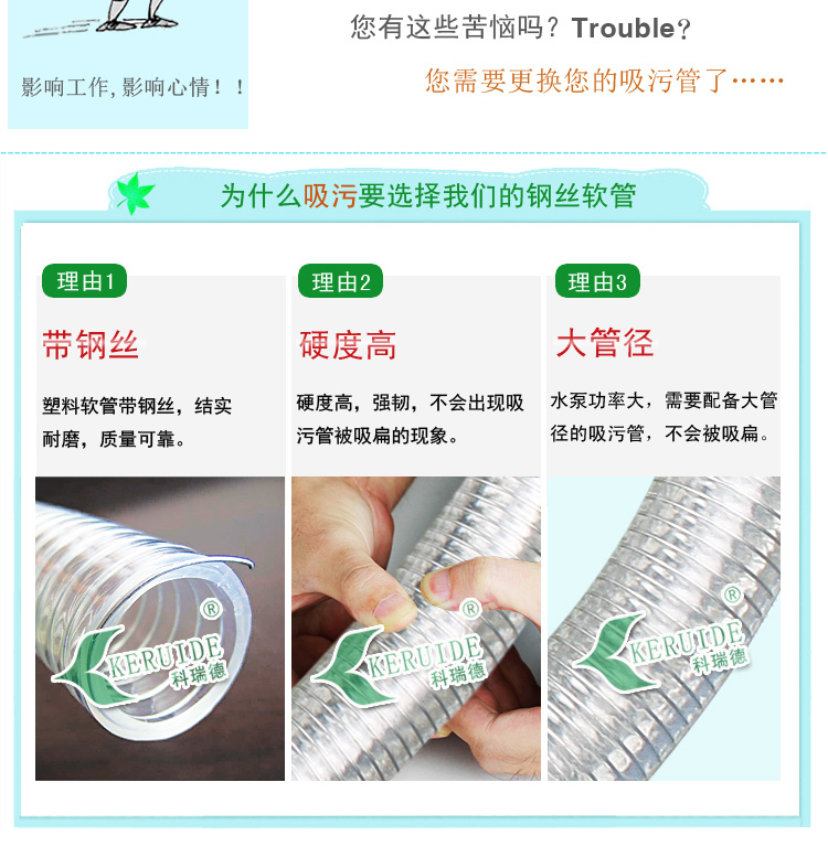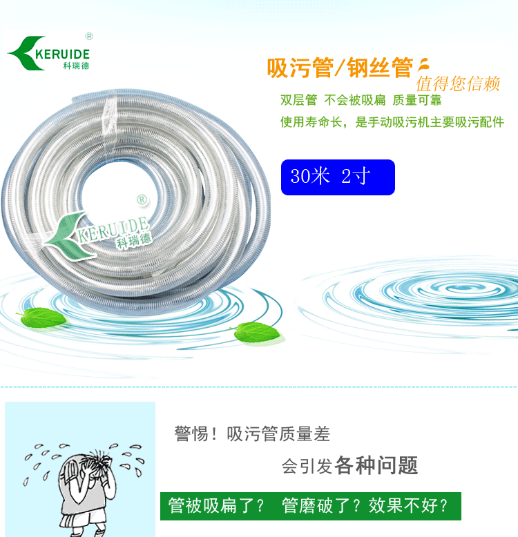 一般這種大管徑的吸污管所配的吸污泵都是功率比較大的,管中加入了鋼絲完全能承受相應的壓力不被吸扁。吸污時由于吸污管較重,不能夠上浮于水面上,因此必須要在管上綁上浮球,不讓它下沉,以有效防止由于移動而攪動池底的細小臟物影響吸污效果。