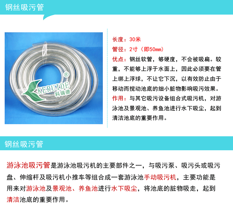 游泳池鋼絲吸污管:本吸污管為帶鋼絲的塑料軟管,也叫鋼絲管,管徑為2英寸(50mm),長度為30米。