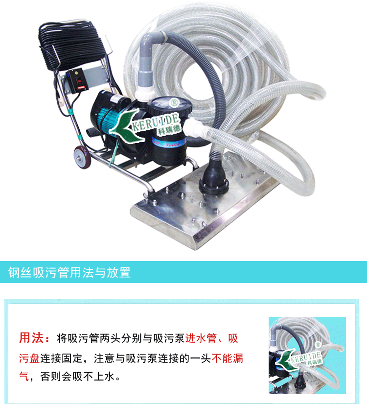 將鋼絲吸污管的兩頭分別與吸污泵進水管、吸污盤連接固定,注意與吸污泵連接的一頭不能漏氣,否則會吸不上水。適用于游泳池手動吸污機