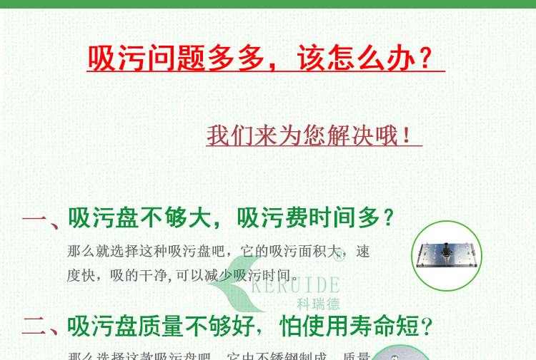 如果你覺得你的吸污盤不夠大,吸污花的時間很多,那么就選擇這種吸污盤吧,它的面積非常大,吸污速度快,可以減少吸污時間。如果你覺得你的吸污盤質量不夠好,怕使用的時間不夠長,那么選擇這款吸污盤吧,它全部由不銹鋼制成,質量有保障,使用壽命更長。如果你覺得你的泳池吸污盤操作不方便,費力,那么選擇這款吸污盤吧,它操作非常方便,同時還帶孔,可以用拉繩式方式操作。如果你覺得你的泳池吸污盤效果不好,也選擇這款吸污盤吧,它獨特的設計使吸污清潔:底部帶毛刷,吸污的同時刷洗池底池壁。
