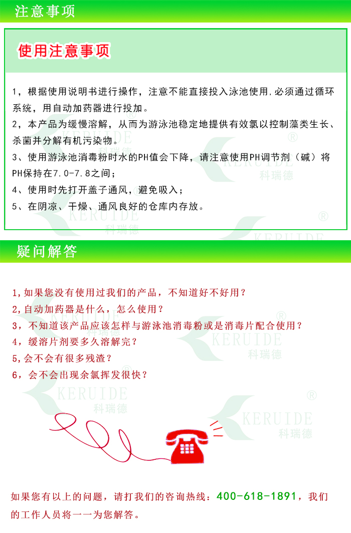 科瑞德緩溶消毒片:是以氯為主要成份的緩溶消毒片,量大可以滅藻,固稱為雙功能消毒片.用于游泳池水體消毒和滅藻,也叫游泳池消毒片。是常用游泳池水處理藥劑。