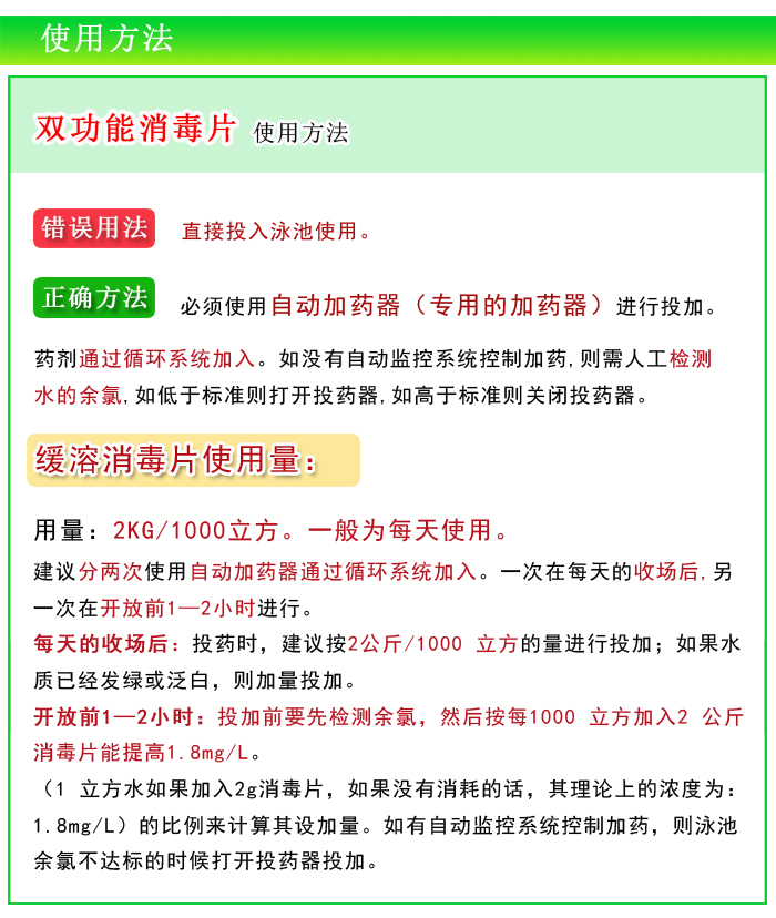 【使用方法】:緩溶消毒片不能直接投入泳池使用,必須使用自動加藥器通過循環系統加入。如沒有自動監控系統控制加藥,則需人工檢測水的余氯,如低于標準則打開投藥器,如高于標準則關閉投藥器。