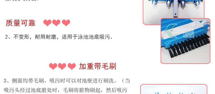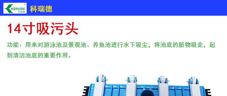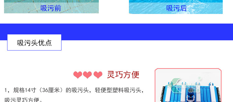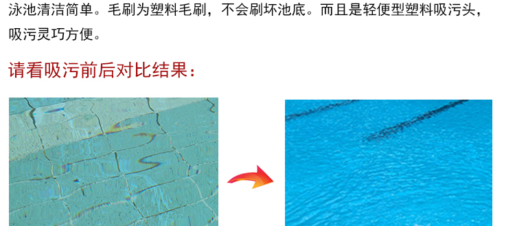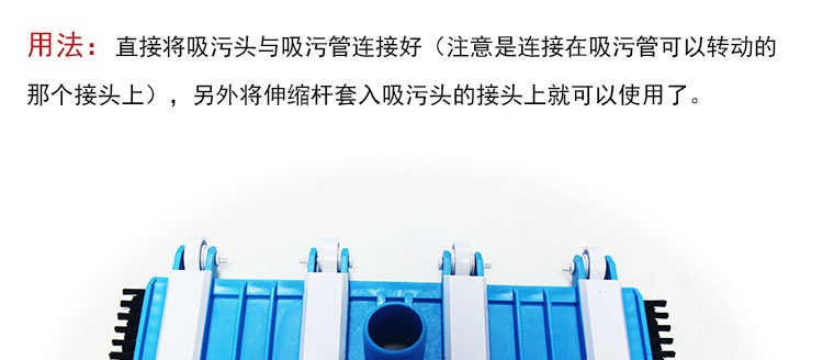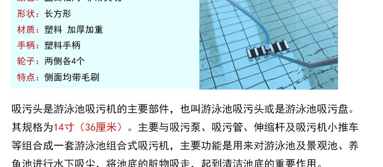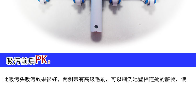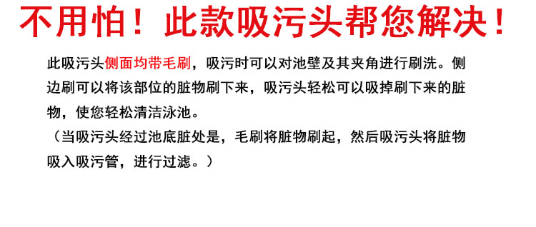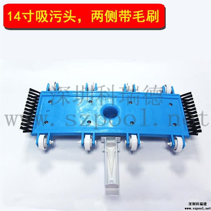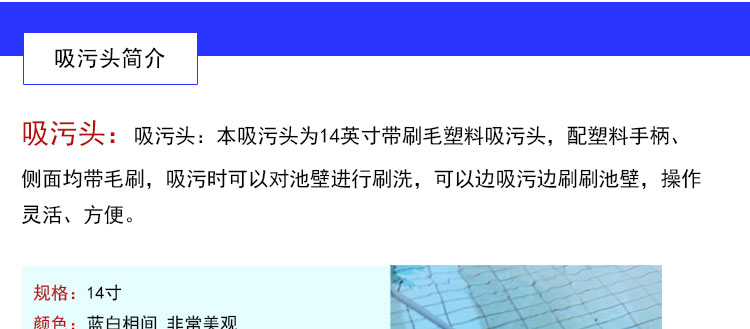 吸污頭:本吸污頭為14英寸帶刷毛塑料吸污頭,配塑料手柄、側面均帶毛刷,吸污時還可以對池底進行刷洗,可以邊吸污邊刷洗池底,操作靈活、方便。