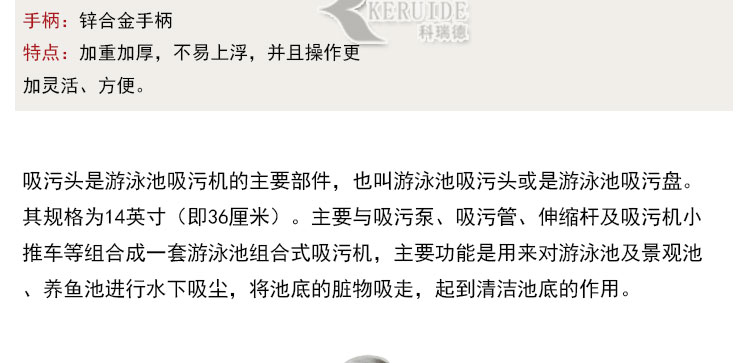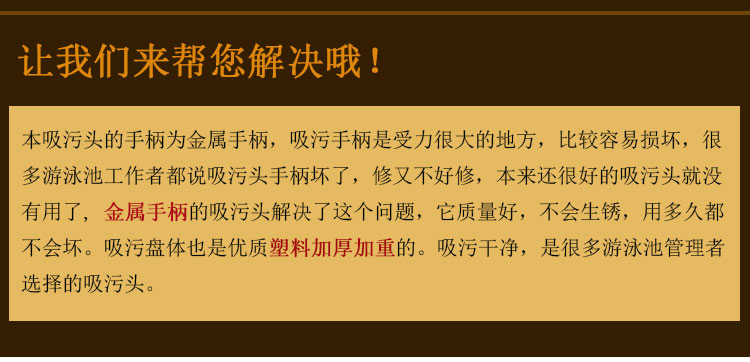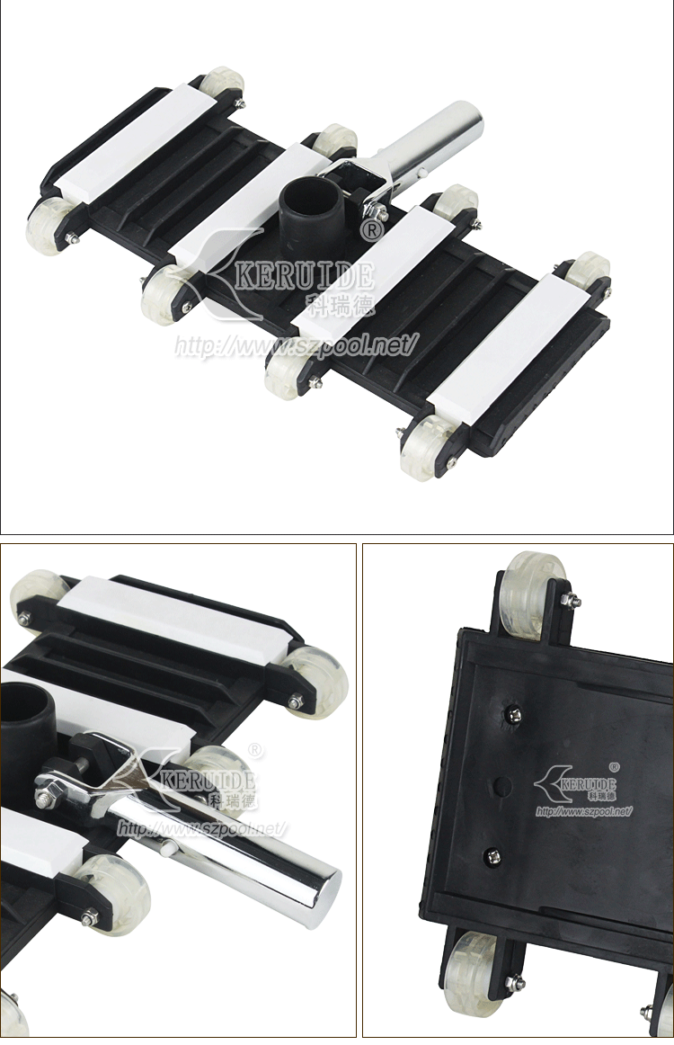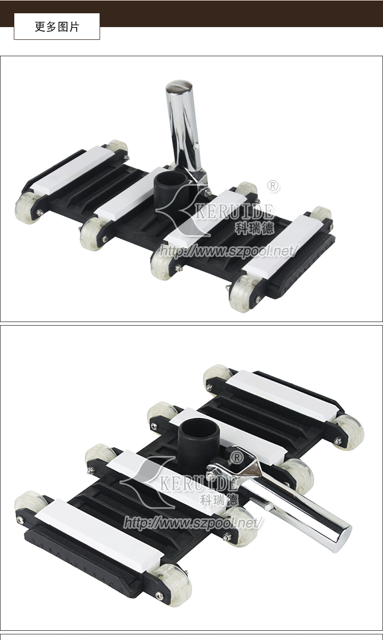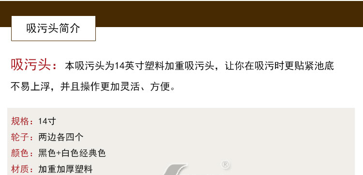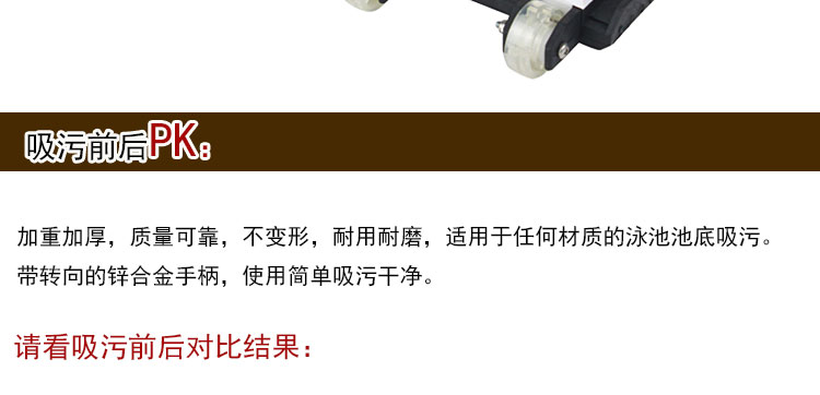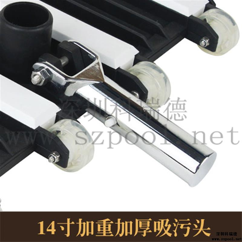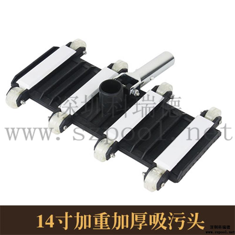 游泳池吸污頭:本吸污頭為14英寸塑料加重吸污頭,帶有鋅合金手柄、聚氨酯料滾珠輪子、ABS吸污管轉換接頭,讓你在吸污時更貼緊池底不易上浮,并且操作更加靈活、方便,質量可靠,耐磨耐用,適合于池底為任何材質的泳池吸污。
