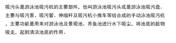 吸污頭是游泳池吸污機的主要部件,也叫游泳池吸污頭或是游泳池吸污盤。主要與吸污泵、吸污管、伸縮桿及吸污機小推車等組合成一套游泳池組合式吸污機,主要功能是用來對游泳池及景觀池、養魚池進行水下吸塵,將池底的臟物吸走,起到清潔池底的作用。