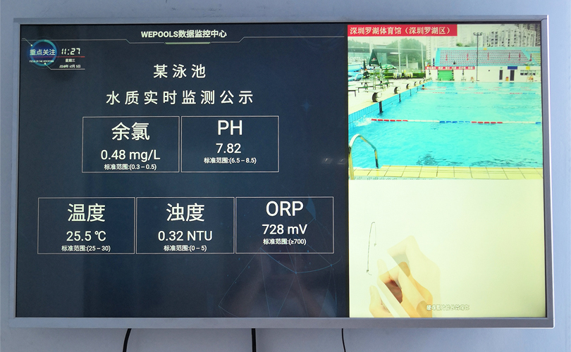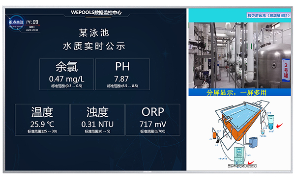 分屏設(shè)置我們可以利用公示屏給公眾展示游泳池設(shè)施及景點、宣傳等,使用這種水質(zhì)顯示屏可以達到多種效果,只要登入就可以顯示,右上角可以根據(jù)用戶需求來設(shè)計,游泳館視頻及日常水質(zhì)維護圖片等,非常實用。
