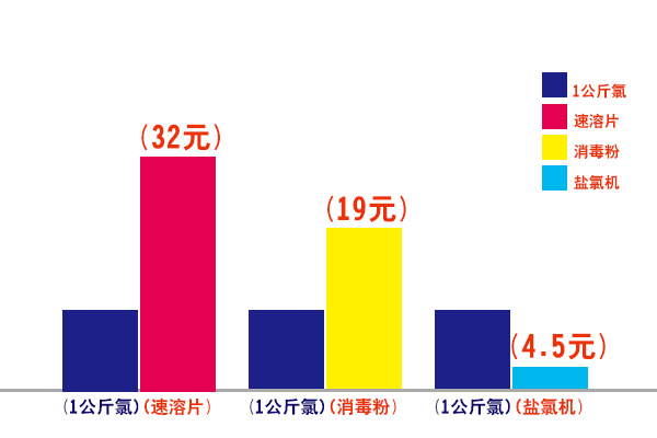 衛普士鹽氯機每1000g/h產氯量來計算。鹽氯機每4.5公斤鹽每小時能產1公斤氯,而鹽是比較廉價的,以1元/kg,那么產1kg的氯,只需要4.5元;