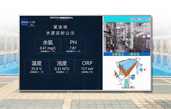 衛(wèi)普士水質(zhì)實時公示屏可顯示水質(zhì)的余氯、pH、溫度、ORP、濁度指標(biāo),并且可以一屏多用,展現(xiàn)游泳場館的游泳設(shè)施等。