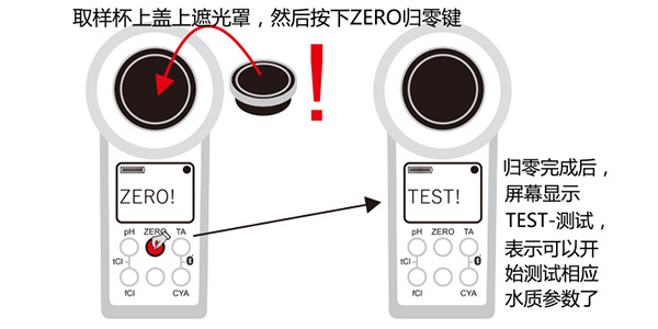注意:儀器每次開機后,首先需要進行空白校正1次,然后就可以陸續(xù)測試不同的參數(shù),如pH、余氯、氰尿酸等,中間無需每次都進行校正,首次校正的結(jié)果將會保持在光度計中,關(guān)機后消失。