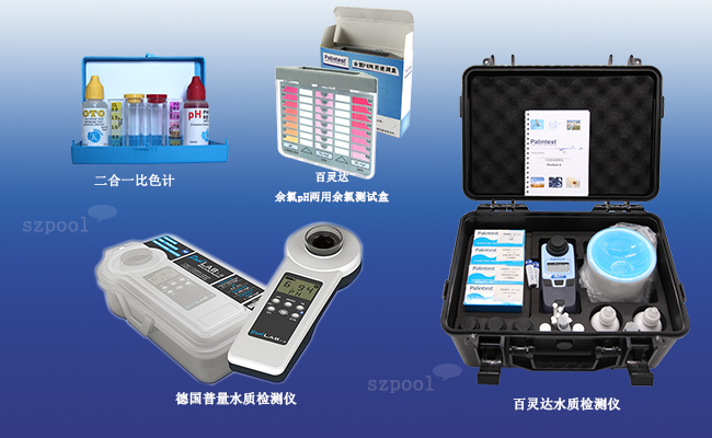 1.?使用水質檢測工具,檢測一下池水的余氯和pH值。常見的檢測工具有余氯pH兩用測試盒,英國百靈達水質檢測儀,德國普量水質檢測儀。