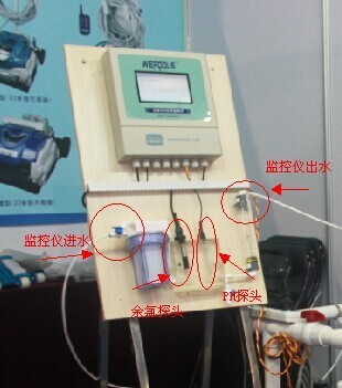 4、安裝細節,如圖4,監測儀取水點出來的軟管接到圖中所示的過濾器前端,余氯電極接在流通池左邊位置,PH電極接在流通池右邊位置,監測水流經流量計(流量通過過濾器前端的開關進行調整,一般設為1.5-2.0L/Min左右)再接一軟管,回到循環管道中。