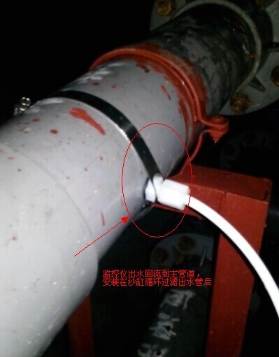 5、安裝細節,如圖5,將從流量計接出來的回水軟管接回到管道中,接口的位置是沙缸后面的管道,一般接在離沙缸位置稍遠一點,以便有一定的壓力差。
